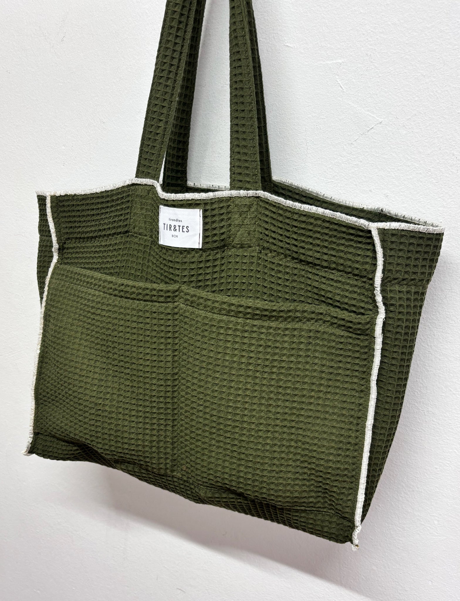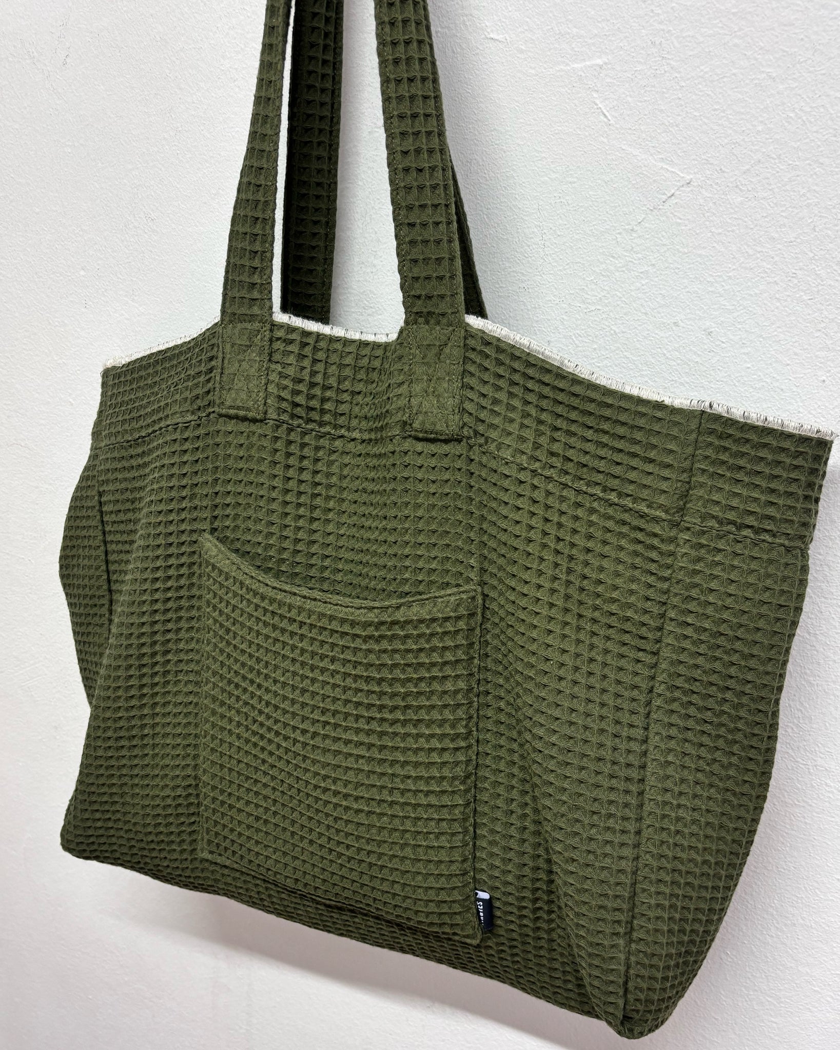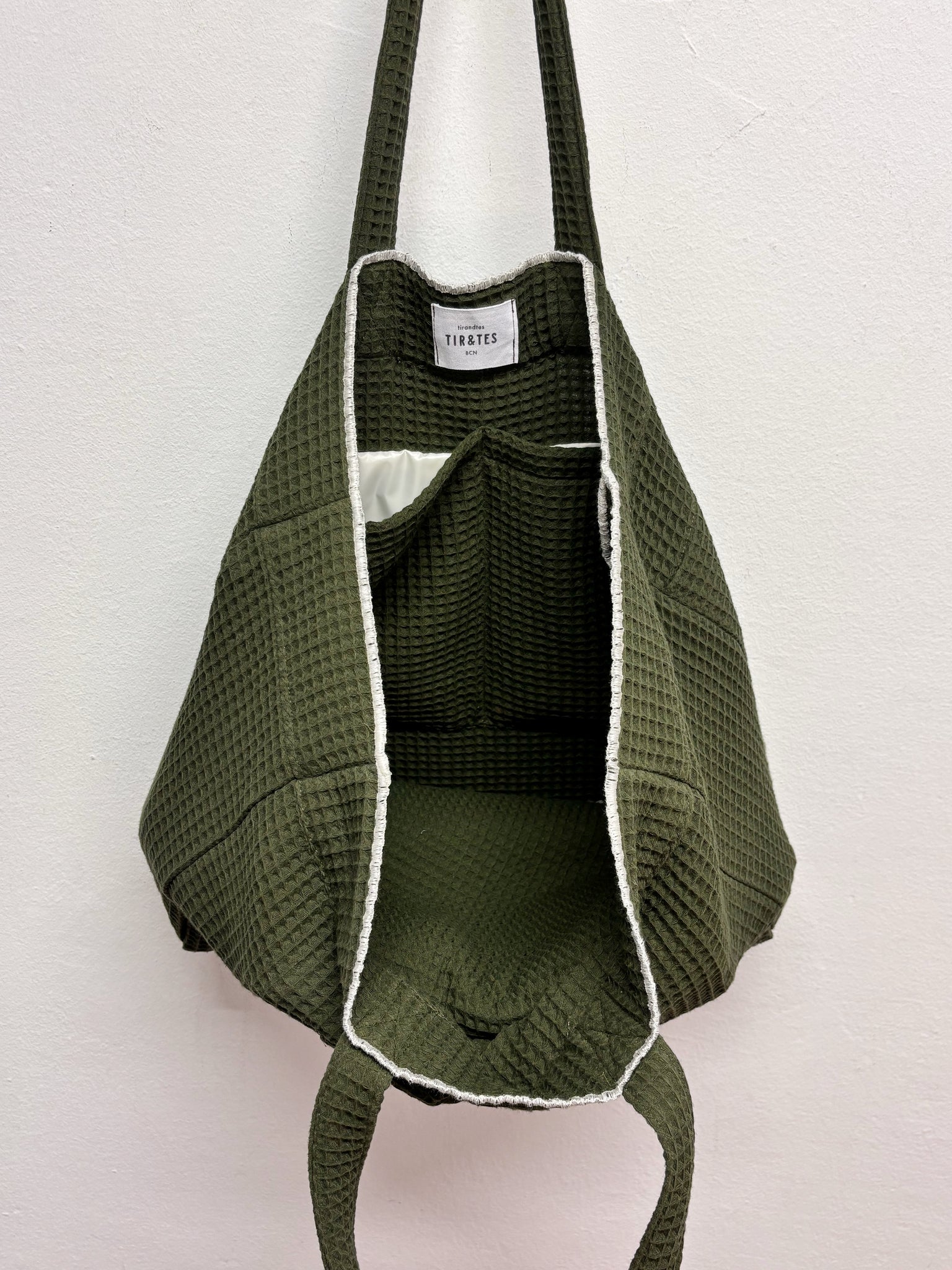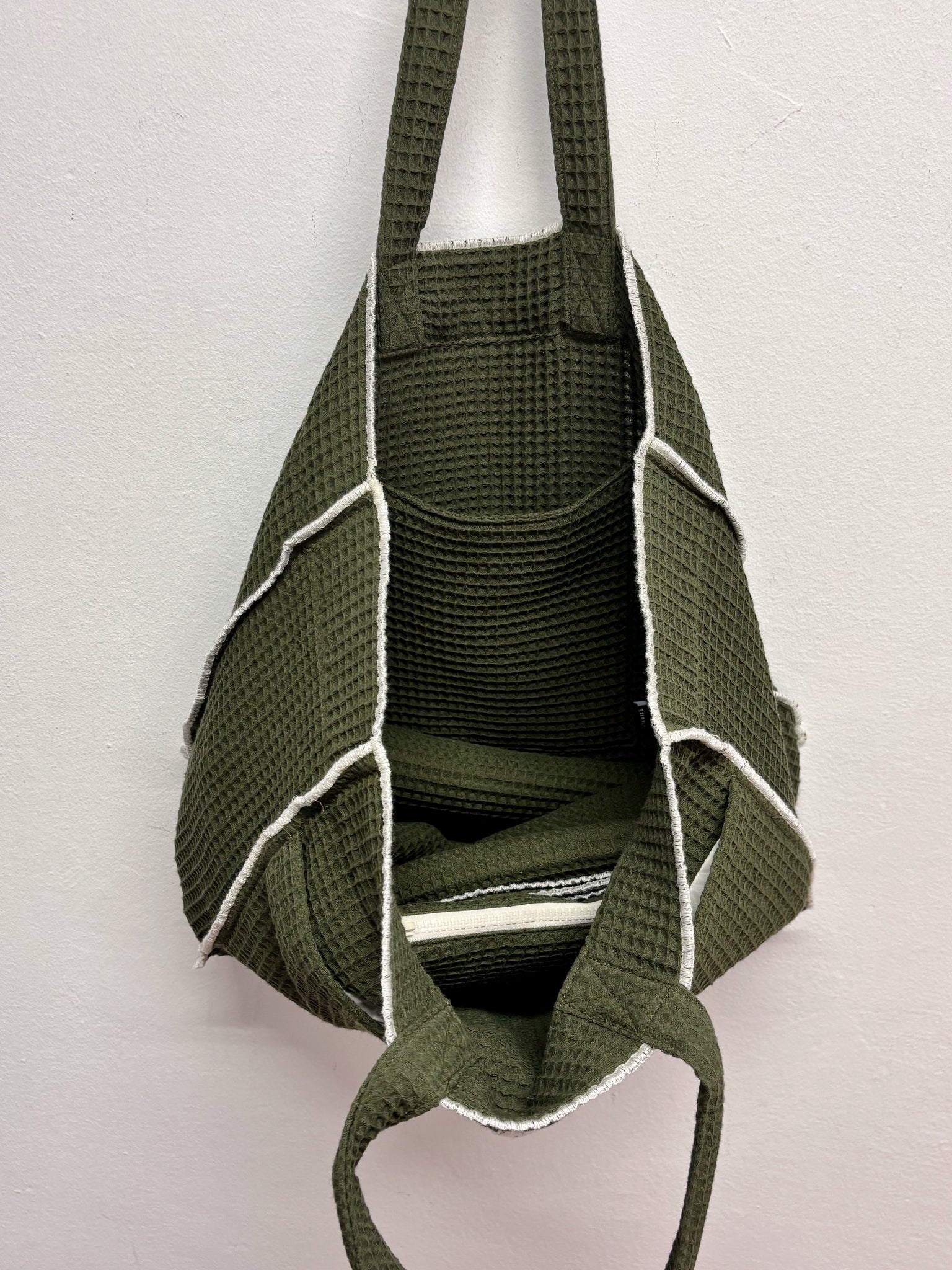 Color: Verde Caqui con costuras ribeteadas en color crudo.
